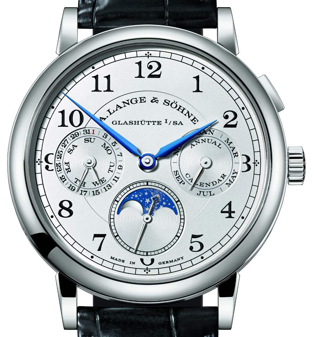 朗格另一款來自 Saxonia 系列的年歷腕表尺寸略小,只有 38.5 毫米寬,而且只是頭發更薄(9.8 毫米厚),盡管它是自動機芯,機芯上裝有 3/4 擺陀。A. Lange & S?hne 1815 年歷表殼寬 40 毫米,厚 10.1 毫米,據我所知,這是大多數男士更喜歡的尺寸。可以通過藍寶石水晶展示底蓋窗口(當然)查看機芯。除了表冠外,表殼還有一個按鈕校正器,以及幾個用于校正日歷功能的嵌入式按鈕。