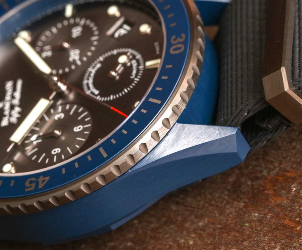 第一款五十噚深海飛返計時海洋承諾腕表采用灰色陶瓷表殼,搭配藍色表圈和表盤。寶珀五十噚深海飛返計時碼表 Ocean Commitment II 采用藍色陶瓷表殼和表圈,然后是金屬灰色表盤,有點顛倒了這個調色板。第一款和第二款 Ocean Commitment 都非常棒,但陶瓷手表愛好者顯然會涌向這款續集限量版。