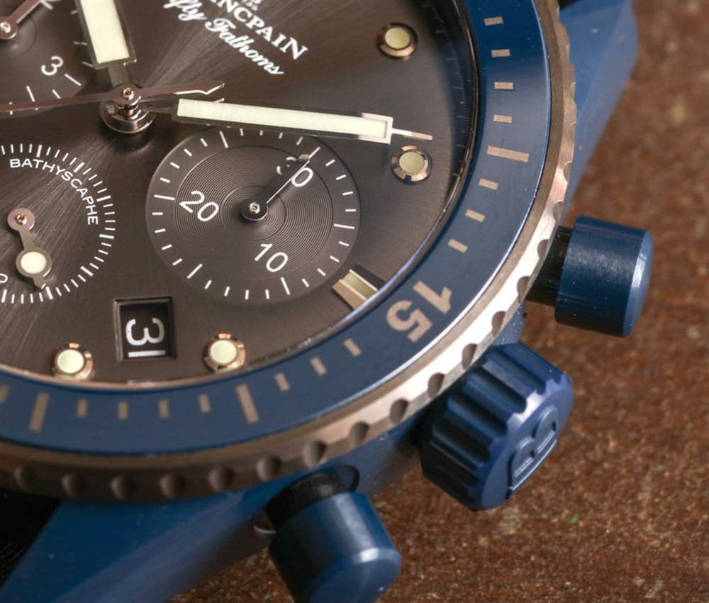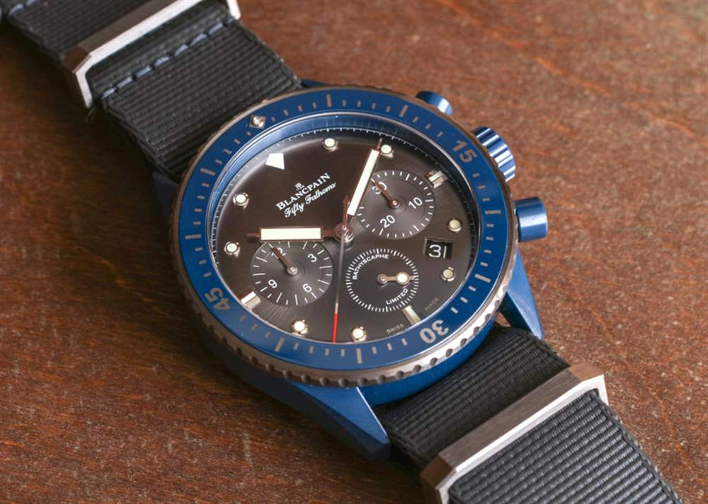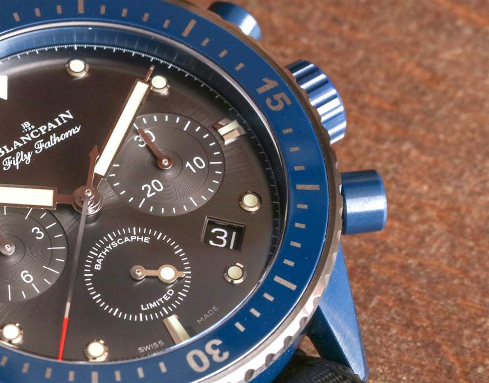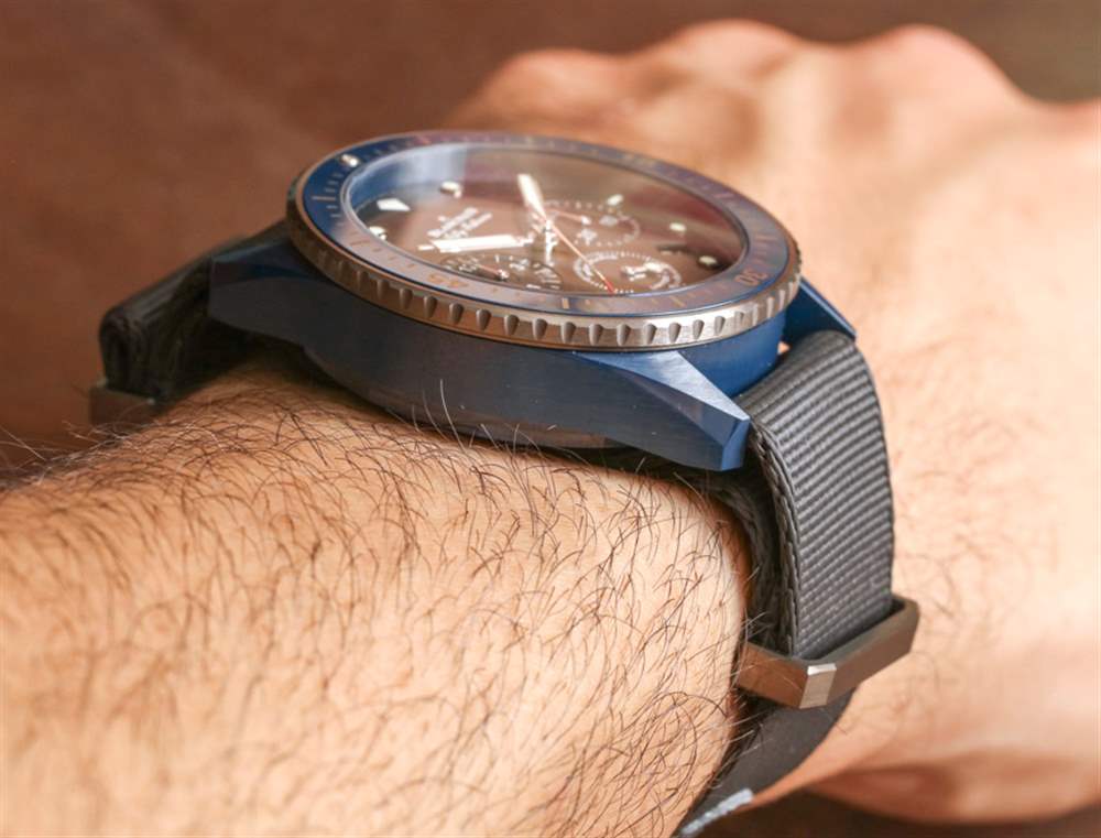 這是我戴過的第一個藍色陶瓷表殼(來自一個奢侈品牌),它看起來很棒——尤其是在有光澤的灰色調旁邊。在某些燈光下,藍色陶瓷看起來就像是黑色,但在光線充足的情況下,表殼材料的豐富藍色調就出來了。寶珀真的不能用藍色調淡一點,因為在生產方面它會使顏色變得太不穩定。