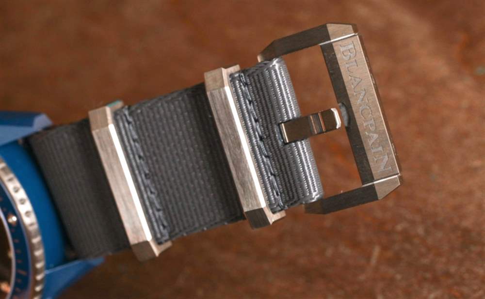 該品牌提供兩個版本的寶珀五十噚深潛器 Flyback Chronograph Ocean Commitment II,無論是灰色紡織/帆布表帶,還是這款帶有灰色鈦金屬硬件的高端 NATO 風格表帶。這是一條非常漂亮的 NATO 風格表帶,但它確實有 23 毫米寬的尺寸,而且在如此高端的手表上也感覺有點奇怪(即使它看起來很酷)。