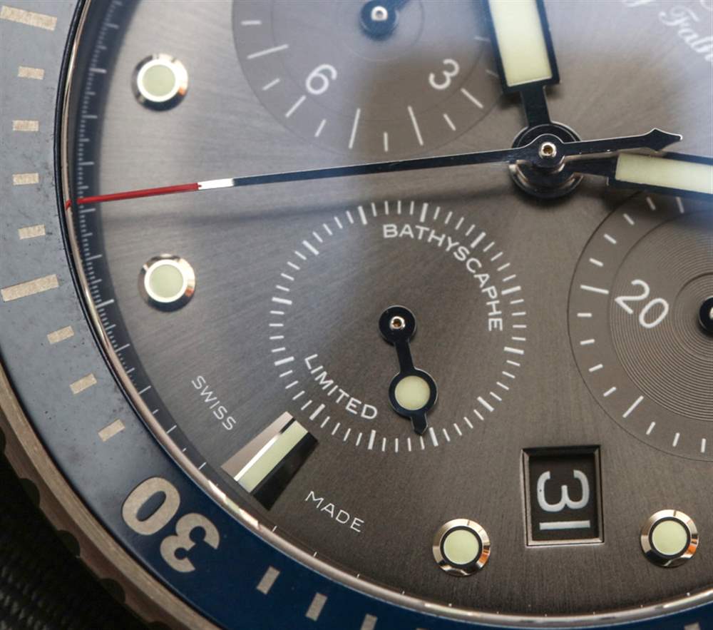 也許表盤上唯一有爭議的元素是日期窗口。它確實有助于手表的銷售具有日期復雜功能。寶珀沒有將日期窗口設計為表盤,這也很好。然而,日期窗口是傾斜的,所以它的位置在 4 點到 5 點之間讀取有點奇怪。此外,日期盤本身是黑色的,比手表本身的“流星灰”表盤顏色要深一些。這真的沒什么大不了的,但這將是人們在其他漂亮的表盤設計中可能會抱怨的一件事。只需看一下表盤,您就會注意到表盤上的其他精彩細節。首先檢查小表盤的巧妙設計,以及大部分拋光的金屬框架時標。
