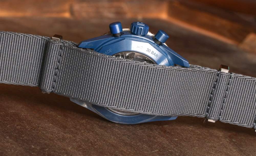 表盤周圍是平穩操作的 120 次點擊、單向旋轉潛水員式表圈。外圈是鈦,液態金屬(與歐米茄共享的另一種技術)和藍色陶瓷作為表圈的其余部分。表冠和按鈕也采用藍色陶瓷制成——同樣精美。