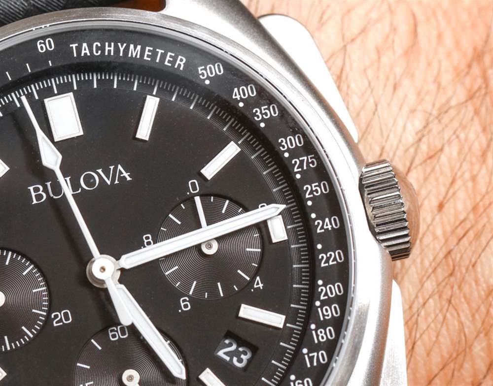 表盤周圍是一個帶有測速儀刻度的凸起 rehaut 環,用于在距離參考點可見時測量速度。您很可能永遠不會使用測速儀刻度,它們作為過去的整潔痕跡繼續存在。凸起的測速刻度環,以及表盤上的應用時標和凹陷秒刻度營造出非常受歡迎的深度感。平面表盤看起來很便宜,而在寶路華特別版月球計時手表中,幸運的是這不是問題。除了令人歡迎的面部三維視圖外,指針和時標的大小也非常合適且非常相稱。在我看來,這使整體表盤設計既實用又美觀。