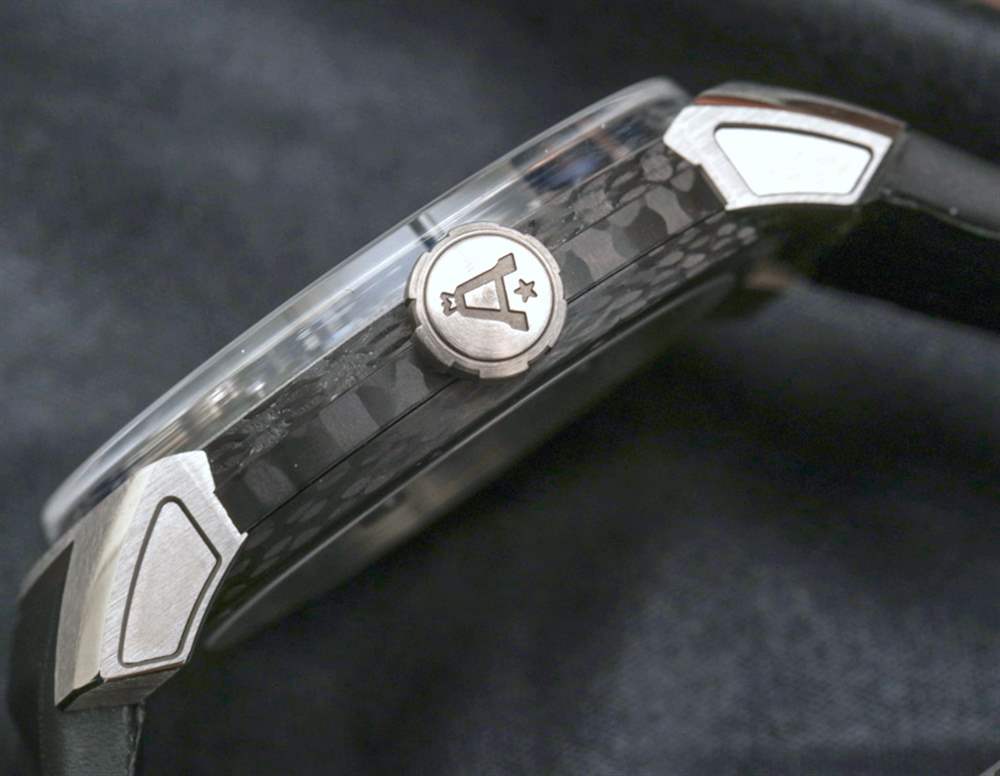 U20 表殼和 calibre A-250 機(jī)芯的重點(diǎn)是為機(jī)芯提供卓越的可視性。出于這個(gè)原因,Angelus決定稱(chēng)它為“超骷髏”。首先是 42 毫米寬(僅 10.3 毫米厚)的表殼,其前后均使用“盒子式”圓頂藍(lán)寶石水晶。夾在中間的是黑色 NPT 碳纖維和鈦。防水深度為 30 米。這顯然是一個(gè)在美學(xué)和材料上都非常現(xiàn)代的設(shè)計(jì)。