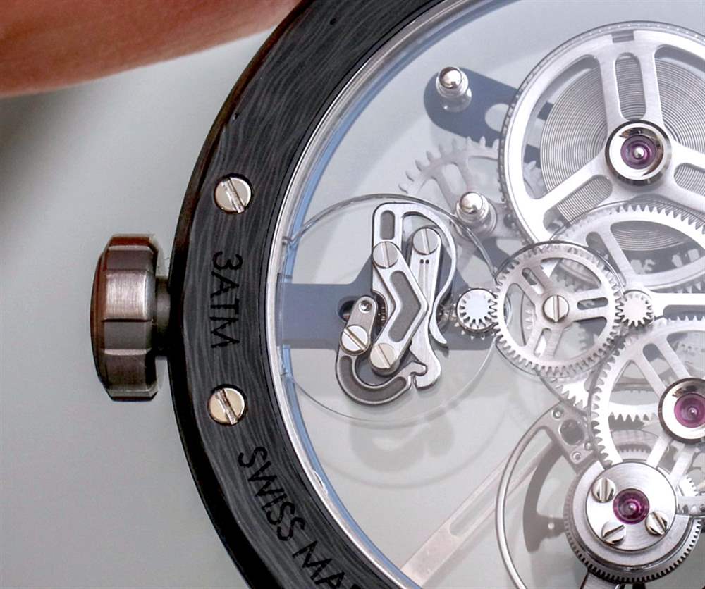 我最喜歡的是美學(xué)精致和專(zhuān)注于機(jī)械元素的結(jié)合,這些元素吸引了我們看書(shū)呆子的最深處。同樣,這一切都要感謝塞巴斯蒂安。Angelus U20 Ultra-Skeleton Tourbillon 旨在成為非常現(xiàn)代的陀飛輪應(yīng)有的典范,同時(shí)為機(jī)芯提供卓越的可見(jiàn)性。我現(xiàn)在應(yīng)該注意到,有兩個(gè)版本的手表可用——這個(gè)事實(shí)很容易被忽略。不同之處在于一個(gè)使用完全透明的藍(lán)寶石水晶底蓋,而另一個(gè)使用半透明的“單向鏡”式底蓋。