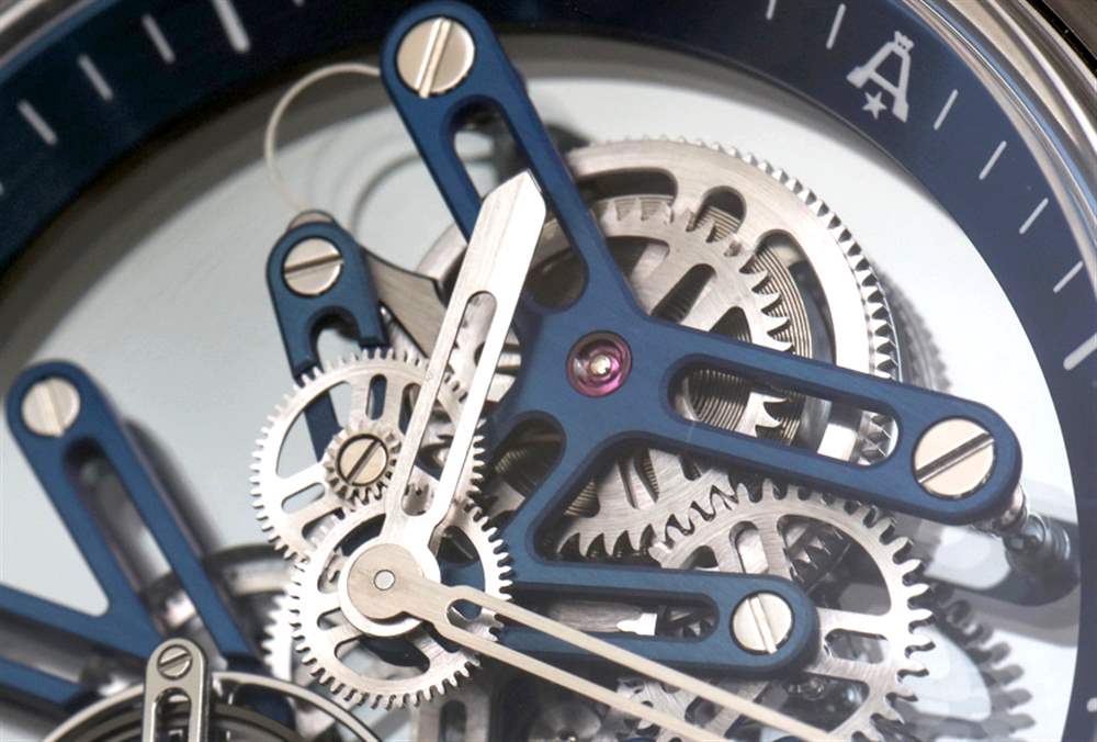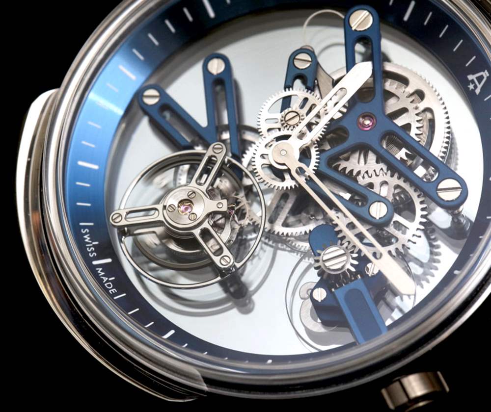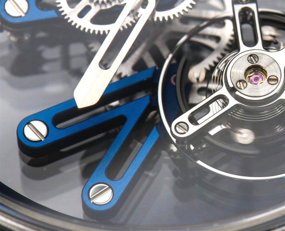 Angelus U20 Ultra-Skeleton Tourbillon 的 A-250 機(jī)芯(似乎幾乎不存在)是各種迷人的透明藍(lán)寶石水晶板,可將所有東西保持在一起,藍(lán)鈦橋板。其他材料,如鍍黃銅、鋼和金用于機(jī)芯的其余部分。從功能上講,機(jī)芯不僅指示時(shí)間,還包括飛行陀飛輪——因?yàn)椤盀槭裁床荒兀俊?/p>