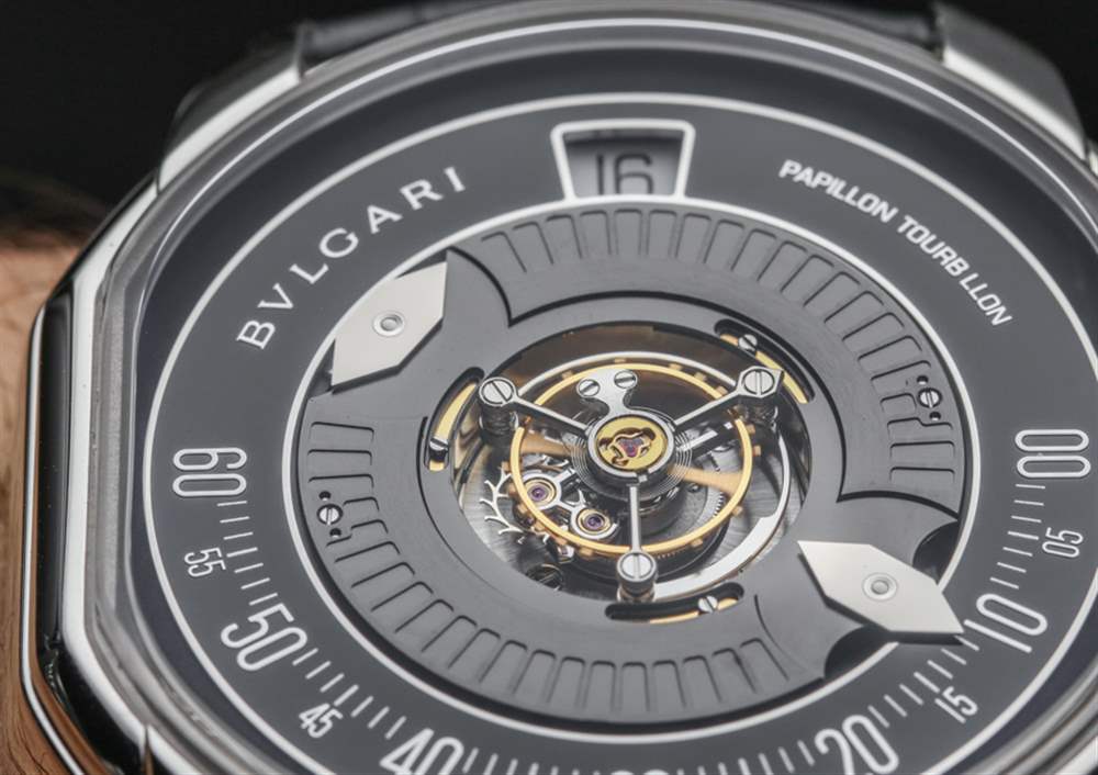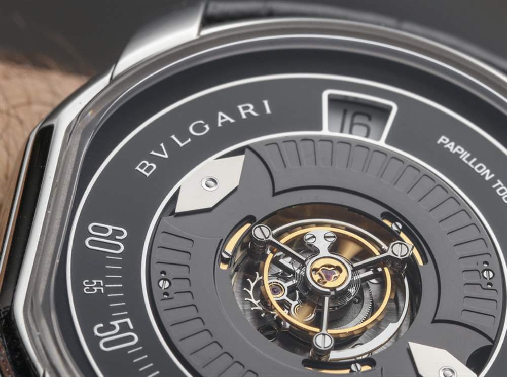 我一直提到 Urwerk 的原因是,雖然 Bulgari Papillon Tourbillon Central 的功能不同,但分針的操作有點相似。正如我之前所說,這不是第一款 Papillon 手表,因為它早于表盤上的寶格麗名稱,但這是我第一次記得它被移動到表盤外圍而不是正確的在中心。