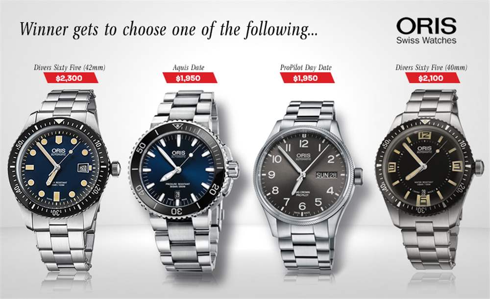 我們選擇了四款豪利時手表(上圖)供獲獎者選擇。為了有資格獲勝,您需要確保在調查中輸入正確的聯系信息(有效電子郵件地址有一個空格)。這些都是很棒的手表,但我覺得為獲勝者提供選擇會很好。一種選擇是手鐲上的 Oris Big Crown ProPilot Day Date(1,950 美元),采用 45 毫米寬的鋼制表殼。然后,在 42 毫米寬表殼中的鋼表鏈上,或在 40 毫米寬表殼中使用不同的表盤(2,100 美元) ,還有 Oris Divers 65(2,300美元)。最后,還有 Oris Aquis Date(1,950 美元)) 在 43 毫米寬的表殼中的手鐲上。您可以在oris.ch查看這些和更多模型。
