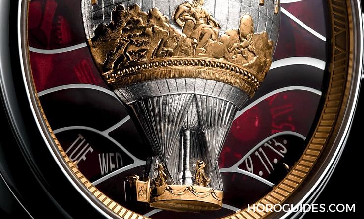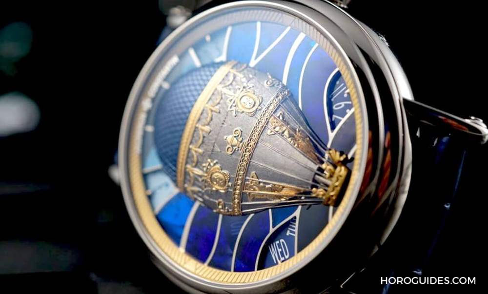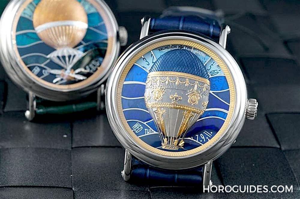 「Aérostiers」即是熱氣球,因此系列的五款腕表,以在法國完成的五次熱氣球飛行壯舉為主題,包括藍色表盤的巴黎1783、巴尼奧勒1785,綠色表盤的巴黎1784、咖啡色表盤的凡爾賽1783,以及紅色表盤的波爾多1784,各自搭配同色系鱷魚皮表帶。