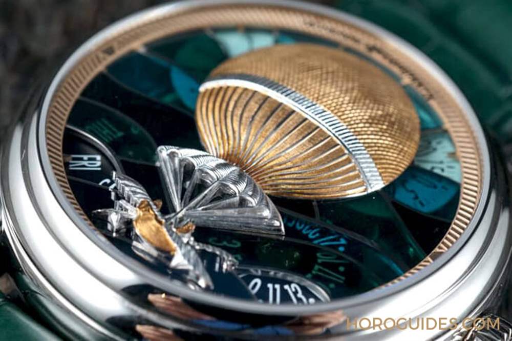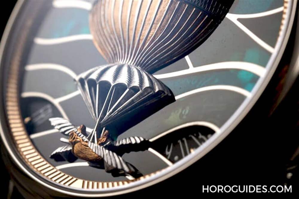 江詩丹頓的Métiers d’Art藝術(shù)大師系列,其工藝之精、主題背景之壯闊,堪稱是表界眾多工藝表中真正可以被稱得上是藝術(shù)作品的系列。2018年的新作品以金雕為重點工藝,結(jié)合琺瑯彩繪,推出Les Aérostiers熱氣球腕表,系列五款腕表各限量5只。