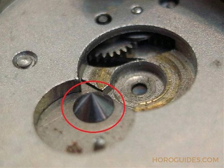 滿鏈時發條盒的上方會凸起,可借以推動能量錐(此時會將撞陀鎖住,不會繼續上鏈,以免軸心磨損)。