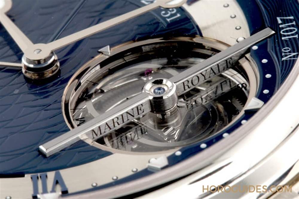 陀飛輪表橋側(cè)邊刻有”MARINE ROYALE”字樣,軸承為藍(lán)色的尖晶石。