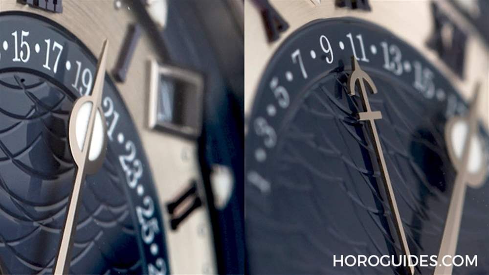 表盤上其他的顯示包括10點(diǎn)半鐘的星期視窗、1點(diǎn)半鐘的月份視窗,8點(diǎn)鐘有80小時(shí)的動(dòng)力儲(chǔ)存顯示窗。指針的設(shè)計(jì)尤其用心,夜光物料的寶璣鏤空時(shí)分指針、船錨形狀的日期指針,以及針尖為太陽(yáng)形狀的真太陽(yáng)時(shí)指針,搭配立體的羅馬數(shù)字時(shí)標(biāo)、凸點(diǎn)刻度還有夜光的梯形金屬塊,各種設(shè)計(jì)各司其職。