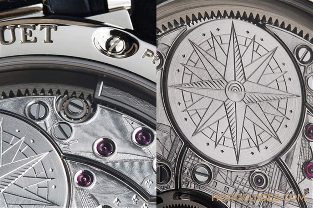 發(fā)條盒蓋上雕刻的是風(fēng)向玫瑰圖案的羅盤,發(fā)條盒邊緣看得到環(huán)型自動(dòng)盤上鏈的輪齒。