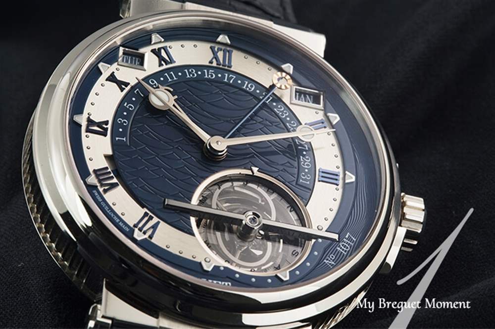 高級(jí)表重視的就是細(xì)節(jié),每一處零件都經(jīng)過(guò)精心的打磨、鐫刻,而寶璣絕對(duì)是這方面的專家。5887表盤特殊的手工鐫刻,是專門為這只表設(shè)計(jì)的波狀紋理,搭配藍(lán)色的金質(zhì)表盤相當(dāng)呼應(yīng)表款的航海淵源。表盤上各區(qū)塊也各有不同的裝飾細(xì)節(jié),羅馬數(shù)字時(shí)標(biāo)圈是霧面拉絲打磨,表盤最外圍則還有波浪狀的雕飾。