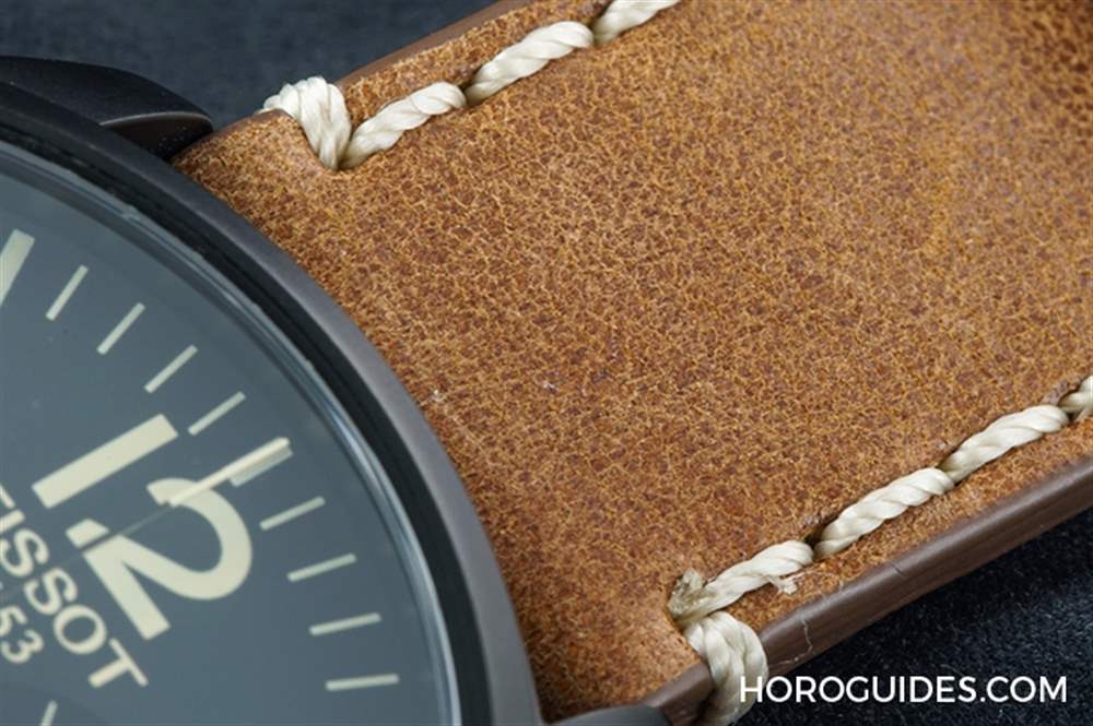 原色牛皮表帶飾有車縫線,再加上牛皮的顆粒讓表帶更有Vintage的復(fù)古味。