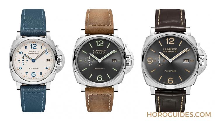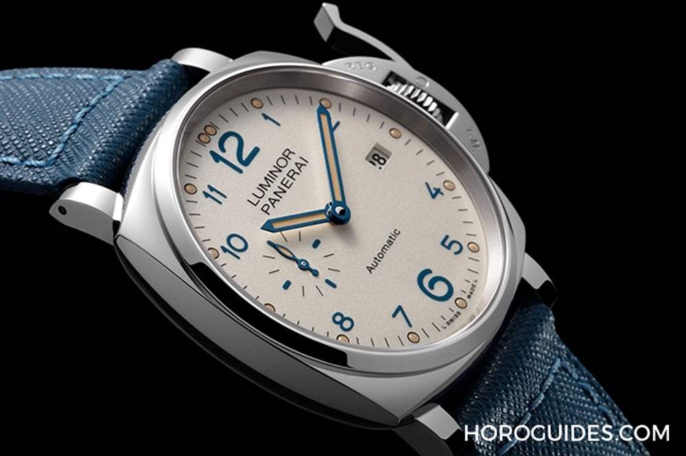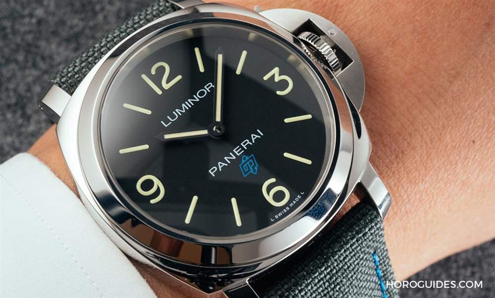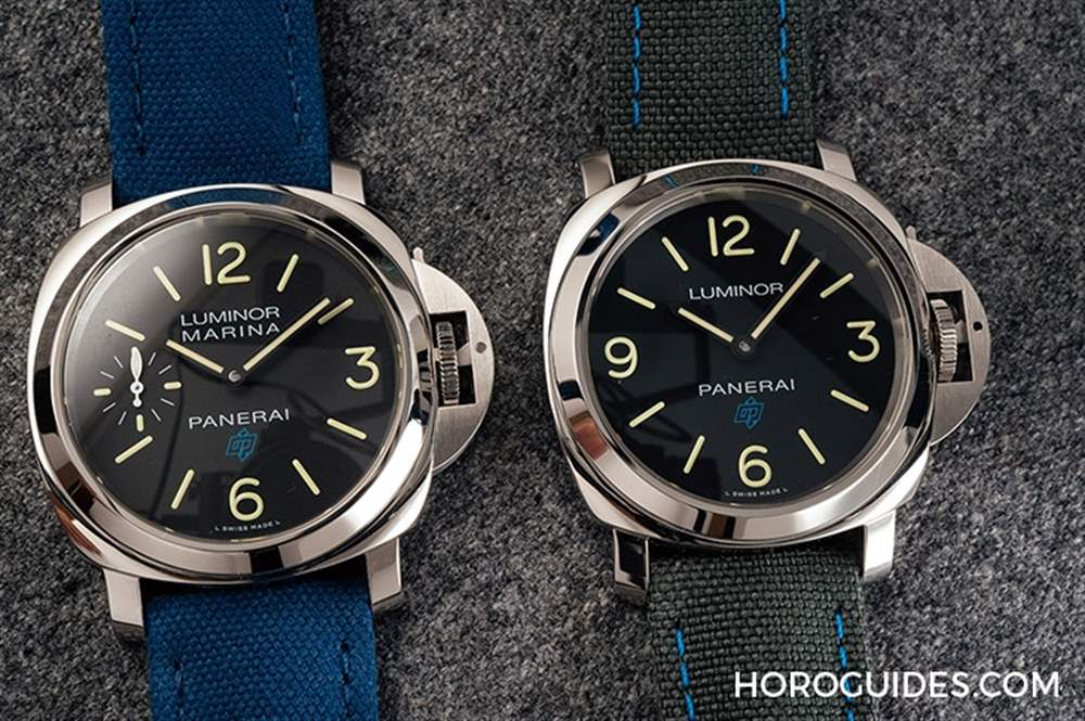 搭配全新自制手上鏈機芯P.6000,左邊為有小秒盤的Luminor Marina Logo,而右邊為兩針的Luminor Base Logo,價格從臺幣15萬4起,并首次搭配布質表帶,價格更親民,風格更年輕。
