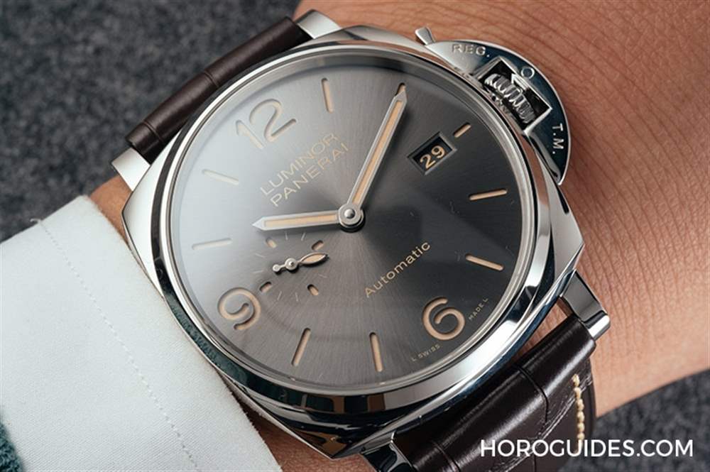 沛納海今年主打Luminor Due系列,與招牌系列Luminor最大差異在于厚度薄了40%,涵蓋38、42到45mm,此為42mm的PAM00906。