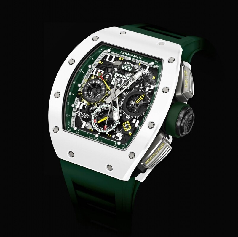 Richard Mille RM11-02 Le Mans Classic是用上NTPT碳纖表殼的同時(shí),也用上陶瓷表圈,有齊飛返計(jì)時(shí)。倒數(shù)計(jì)時(shí)、年歷、兩地時(shí)間以及測(cè)速計(jì)