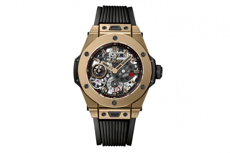 運動型腕表多是賣靚樣,夠搶眼硬凈已經夠高分,難得Hublot這枚也有內涵,足足提供10天動存,以sports watch來說屬罕見了。45mm表殼用上品牌獨家調制的Magic Gold,它是世上最堅硬的黃金,比一般黃金更有效防刮,色澤亦深沉一點,感覺低調而不落俗套。表盤用上鏤空結構,機芯運作一覽無遺,6時位置更設有一個數字轉盤,顯示動力儲備日數。