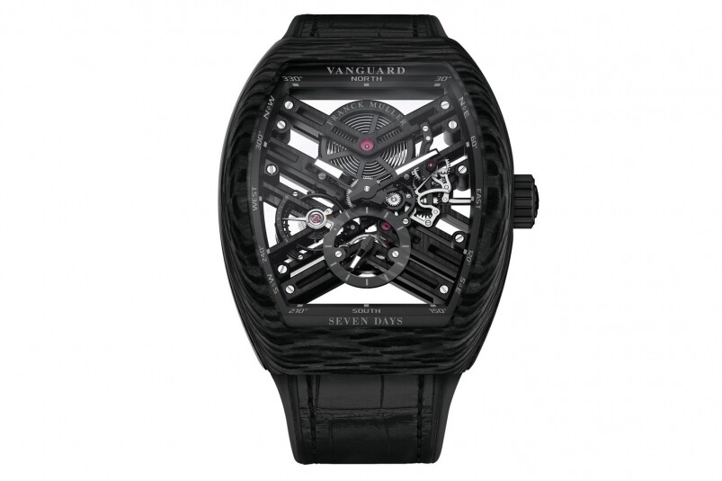 酒桶形表殼一向是Franck Muller的招牌設計,這枚Vanguard特別用上碳纖維表殼,獨特紋理布滿表殼表面,正下方寫有「SEVEN DAYS」,明刀明槍告訴大家它有7日鏈。最搶鏡的自然是鏤通得非常徹底的表盤,用家可一邊欣賞表橋的建筑幾何美感,一邊感受機械機芯的心跳。