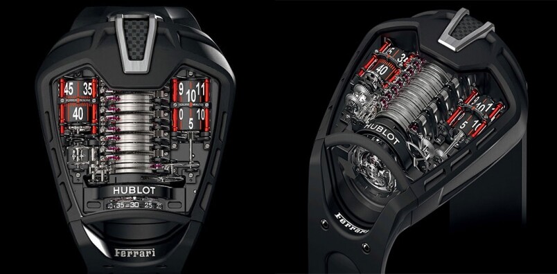 至于世上最長動能的機械腕表,非2013年面世的Hublot MP-05 LaFerrari莫屬,品牌史無前例地將11個發條鼓一脈相連,提煉出馬拉松式的50日動存。腕表的外形設計已經先聲奪人,上鏈方法同樣出位,就是用Hublot 特制的迷你電鉆為機芯「上膛」,相當架勢!