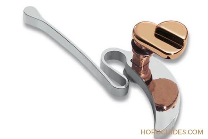 同樣是力求保持表殼形狀的流線圓滑,微凹小按鈕必須以調(diào)校針或是尖細的物品來戳按,當(dāng)手中沒有相關(guān)工具時,就無法進行調(diào)整;而寶鉑的推桿隱藏式調(diào)校,撥動推桿在表殼凹槽內(nèi)推動齒輪,進而連動調(diào)校機關(guān)。雖然用手指撥動小小的推桿仍然會需要一點熟練度,但至少不用限制手邊一定要有工具。