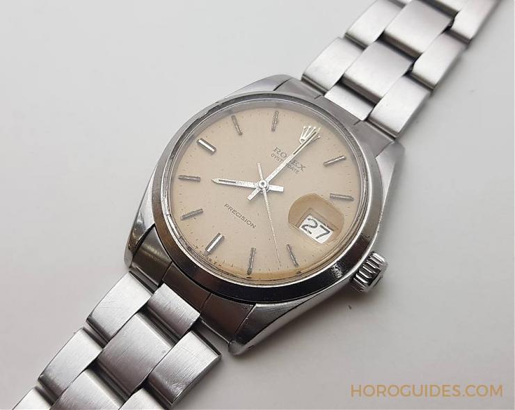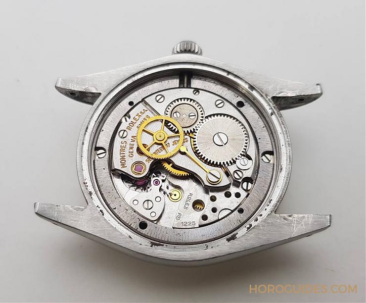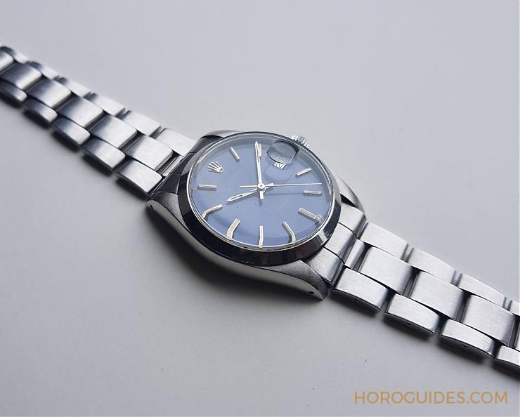 6694是Rolex Oyster末代的手上鏈款,同樣堅固耐用,近期硬是從朋友手上入手一只(年份是1972年,完全無拋磨整理),目前這已是稀有表款,藍面更是罕見。6694搭載1225機芯,震頻21600,單層抗溫差合金游絲,環形擺輪。雖然不像前一代的1210,震頻18000,雙層藍鋼補償螺絲擺輪,不過依然有Rolex 擒縱結構精密的特性。在三臂式近擺輪的位置各有一顆砝碼,可以用來微調快慢或方向差,發揮Rolex 精準的特質。