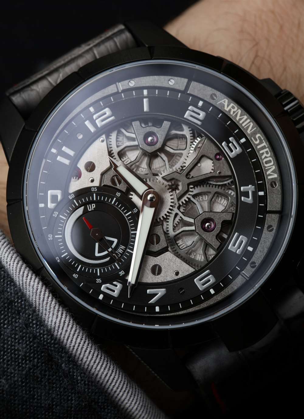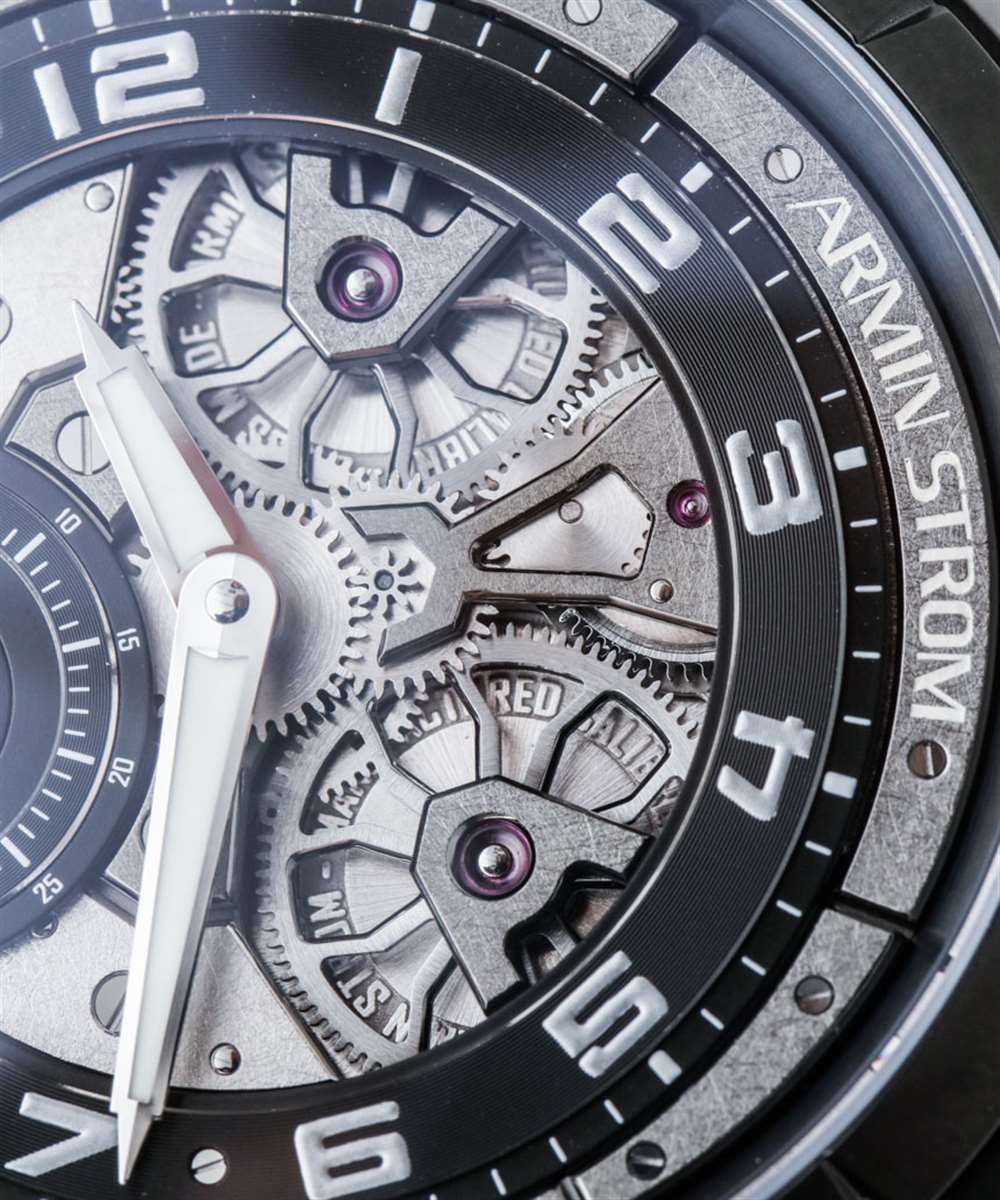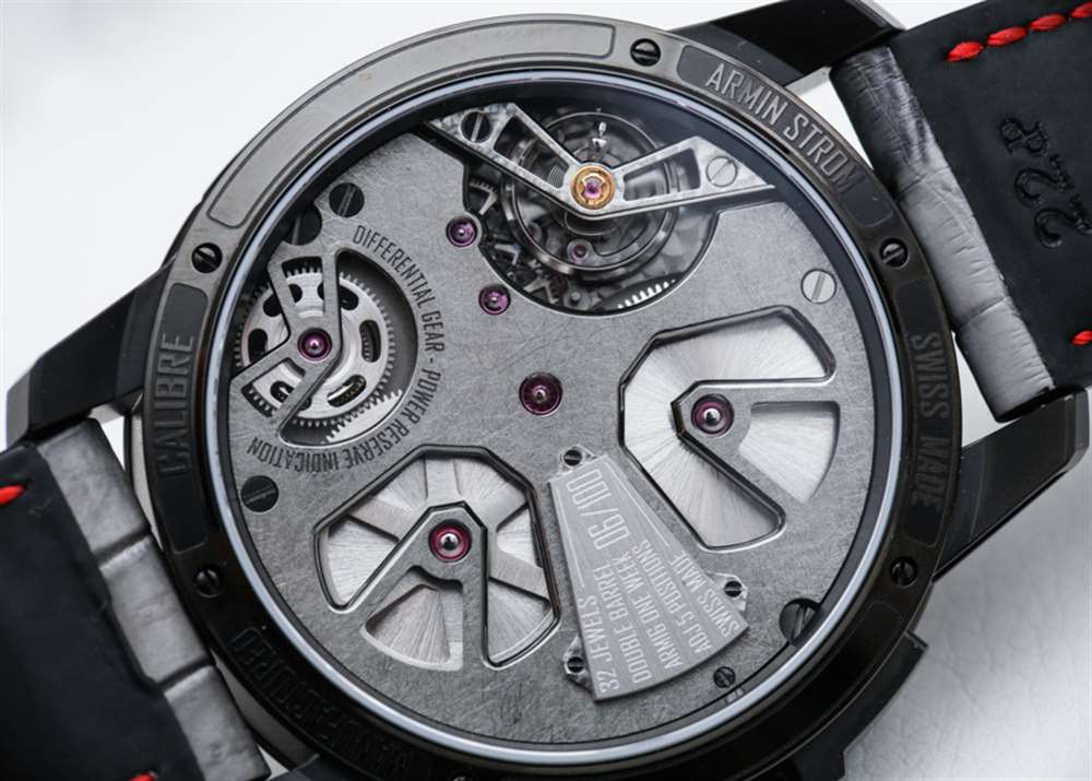 該機芯是他們一貫可愛和前衛的內部機芯 ARM16。ARM16 由 194 個帶有雙主發條盒的零件制成,以 2.5Hz(18,000 bph)的頻率運行,并具有長達 8 天的動力儲存。手動上弦機芯指示時間有點偏左,并進一步提供了一個輔助秒盤,其中還包括一個方便的動力儲存指示器。Armin Strom 保留了他們高度可見的 lume 時針和分針風格,秒針和動力儲存指示器的子表盤似乎是新的。