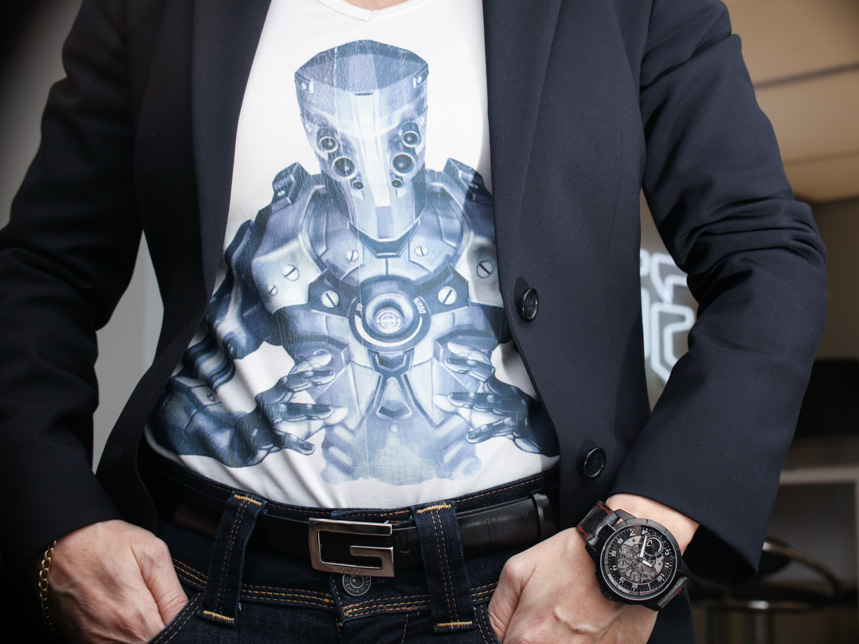在Baselworld 2016 的Armin Strom展位前走過的任何人都會情不自禁地注意到他們的貿易展總部到處貼滿了一個很酷的角色——這是為他們制作的,以紀念新的 Armin Strom Edge 手表系列。藝術效果圖相當不錯,老實說,后來我才知道它是受 Armin Strom 委托,由一位名叫Herbert Kracke的瑞士當地藝術家繪制的。以藝術家名字 Tarkin 命名,來自瑞士比爾,local 也是 Armin Strom 品牌的朋友,擁有令人難以置信的涂鴉風格科幻藝術組合。