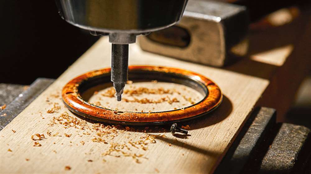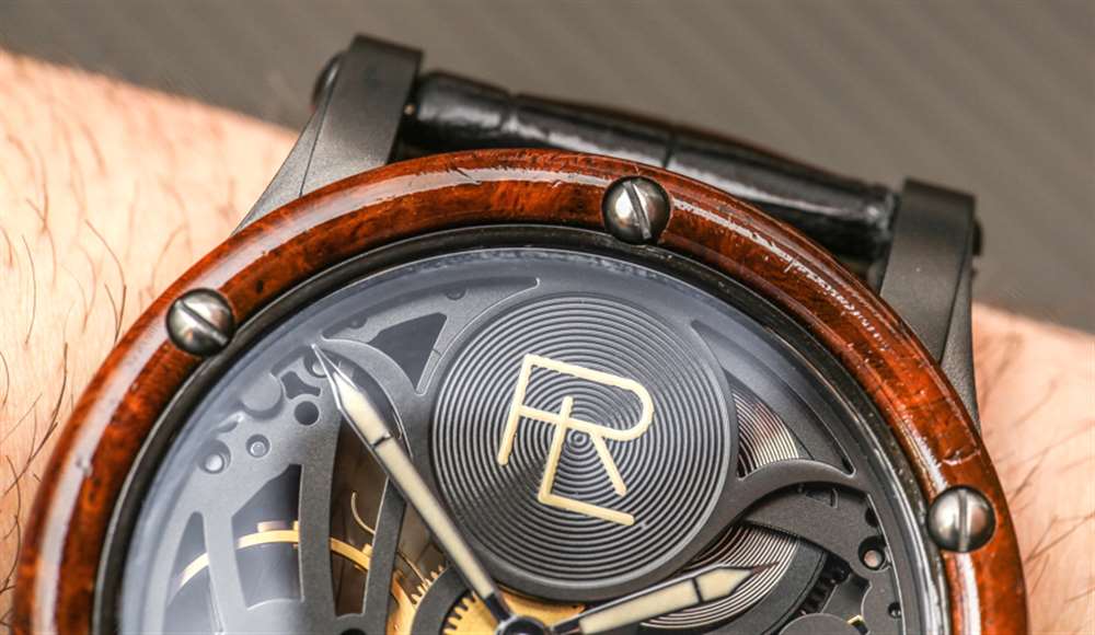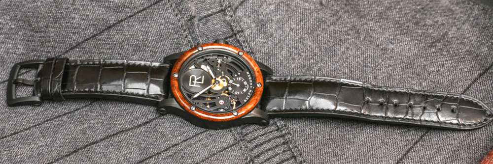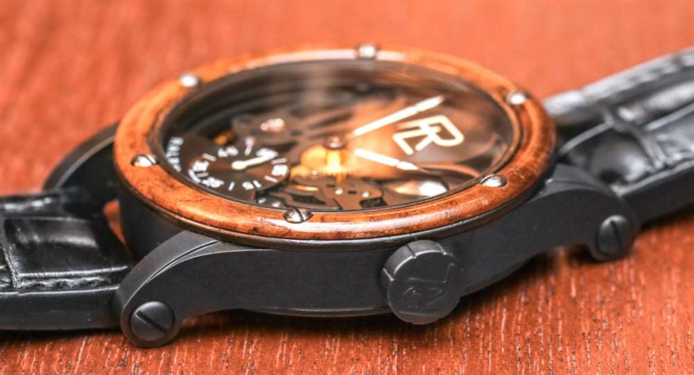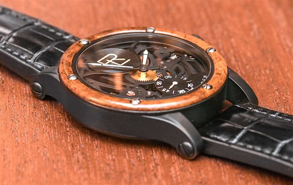 這兩款手表均采用 44.8 毫米寬、11.2 毫米厚的鋼制表殼,防水深度達 50 米。兩者均采用黑色 PVD ??涂層,并進行了噴砂處理,我喜歡這種處理方式,因為它與光滑的鱷魚皮表帶和木材上的漆面處理形成鮮明對比。非鏤空版本還采用自然的拉絲精鋼表殼和配套的精鋼表鏈。Amboyna 樹節木表圈的出色之處在于,木質材料沒有放置在藍寶石水晶下方,可以觸摸。能夠感受和感知木材的溫暖和質地是一種觸覺上的樂趣,我認為這對于將木材放在手表的外部非常有價值。