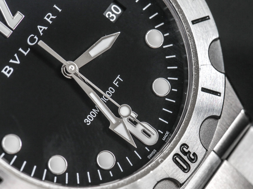 寶格麗真的淡化了表盤文字,只包含品牌名稱和防水信息。手表收藏家往往對表盤上的文字非常挑剔——這往往是不必要的。將新一代 Bulgari Diagono Scuba 與舊型號進行比較,您會看到更少的文字。表盤符合意大利風格,并非純粹的功利主義,而是與任何意大利設計的物品一樣的包豪斯風格。易讀性得益于時針和分針的形狀不同,阿拉伯數字 12 點和 6 點鐘的時標有助于很好地定位表盤。日期指示窗位于 3 點鐘位置,既實用又不會過分突出。