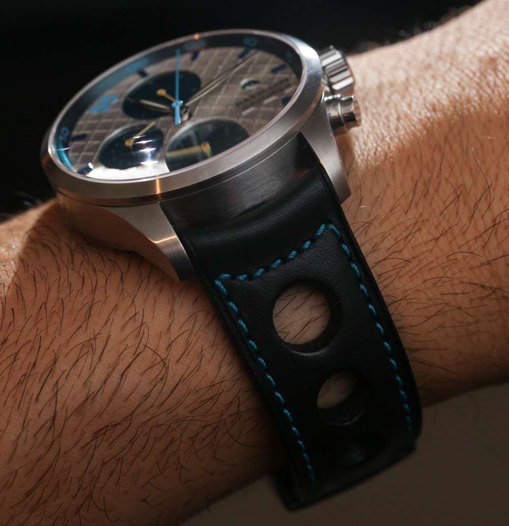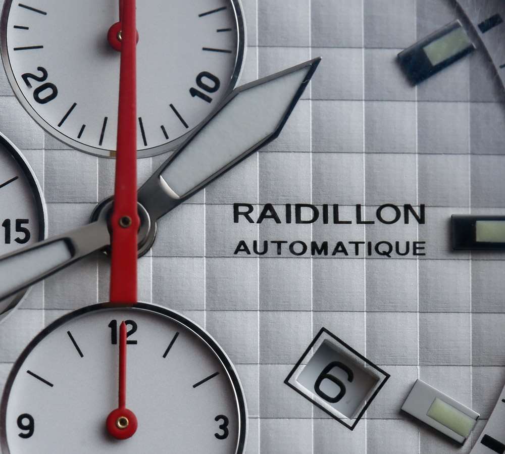 從主題上講,Raidillon 讓我想起了居住在瑞士蘇黎世的Maurice de Mauriac。這些較小的品牌中的每一個都在盡可能多地使用美觀且多功能的表殼和表盤設(shè)計。您可以看到與瑞士 ETA Valjoux 7750 自動計時碼表機(jī)芯結(jié)合使用時如何享受大量炫酷選擇。