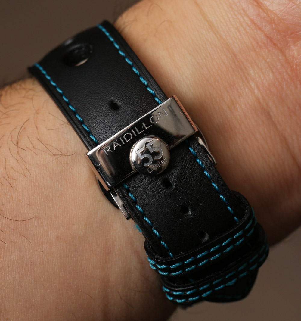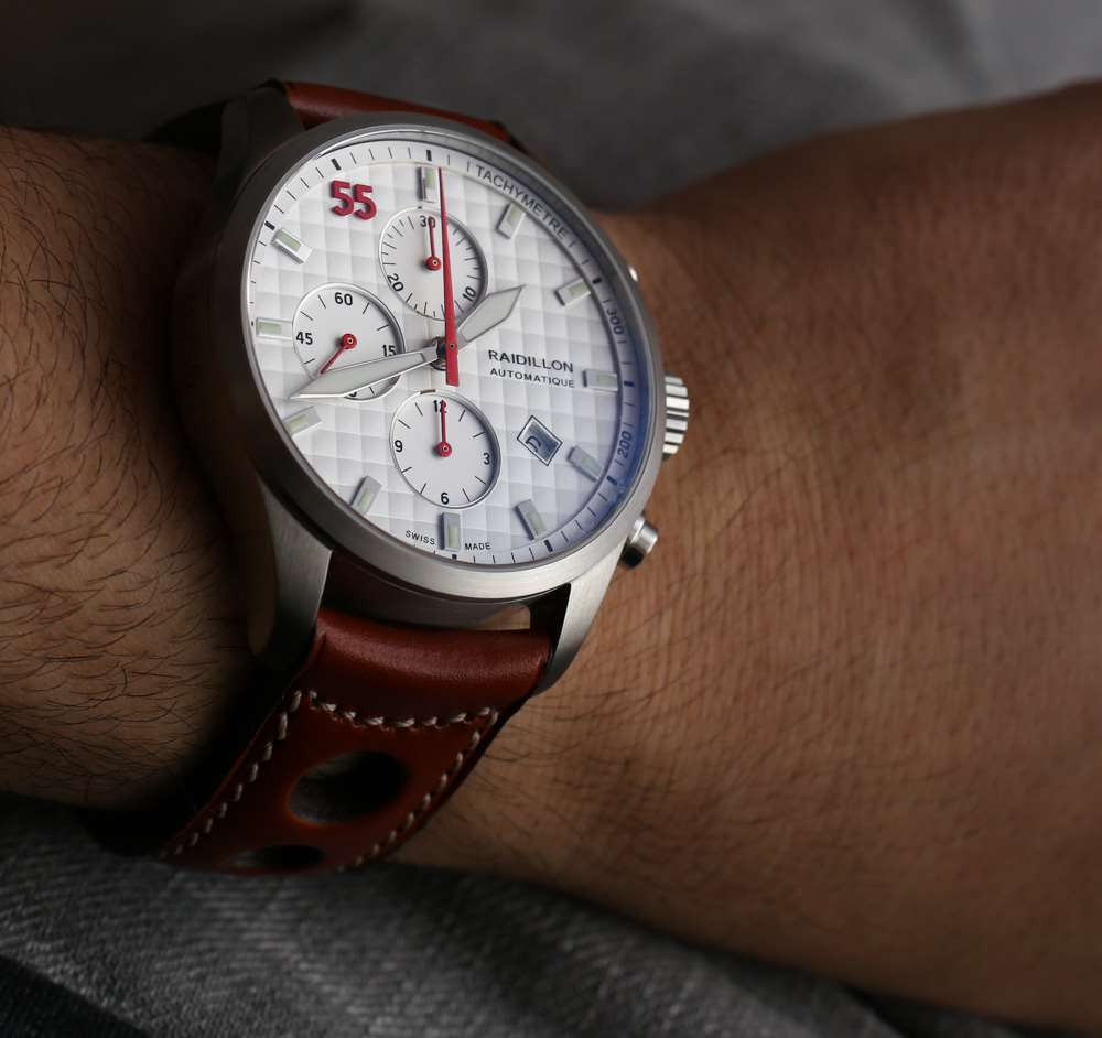 然而,根據(jù) Raidillon 的說法,這些表帶是在比利時生產(chǎn)的——與手表其余大部分的制造地相比,它應(yīng)該離家更近。每款 Raidillon Chronograph 手表都是限量發(fā)行 55 件的一部分,這個數(shù)字也是品牌的重要組成部分,不僅在表盤上設(shè)計得非常顯眼,而且在品牌自己的標(biāo)志上。這個數(shù)字來自于 Raidillon 顯然受到啟發(fā)的某種比賽類型中的最大汽車數(shù)量。
