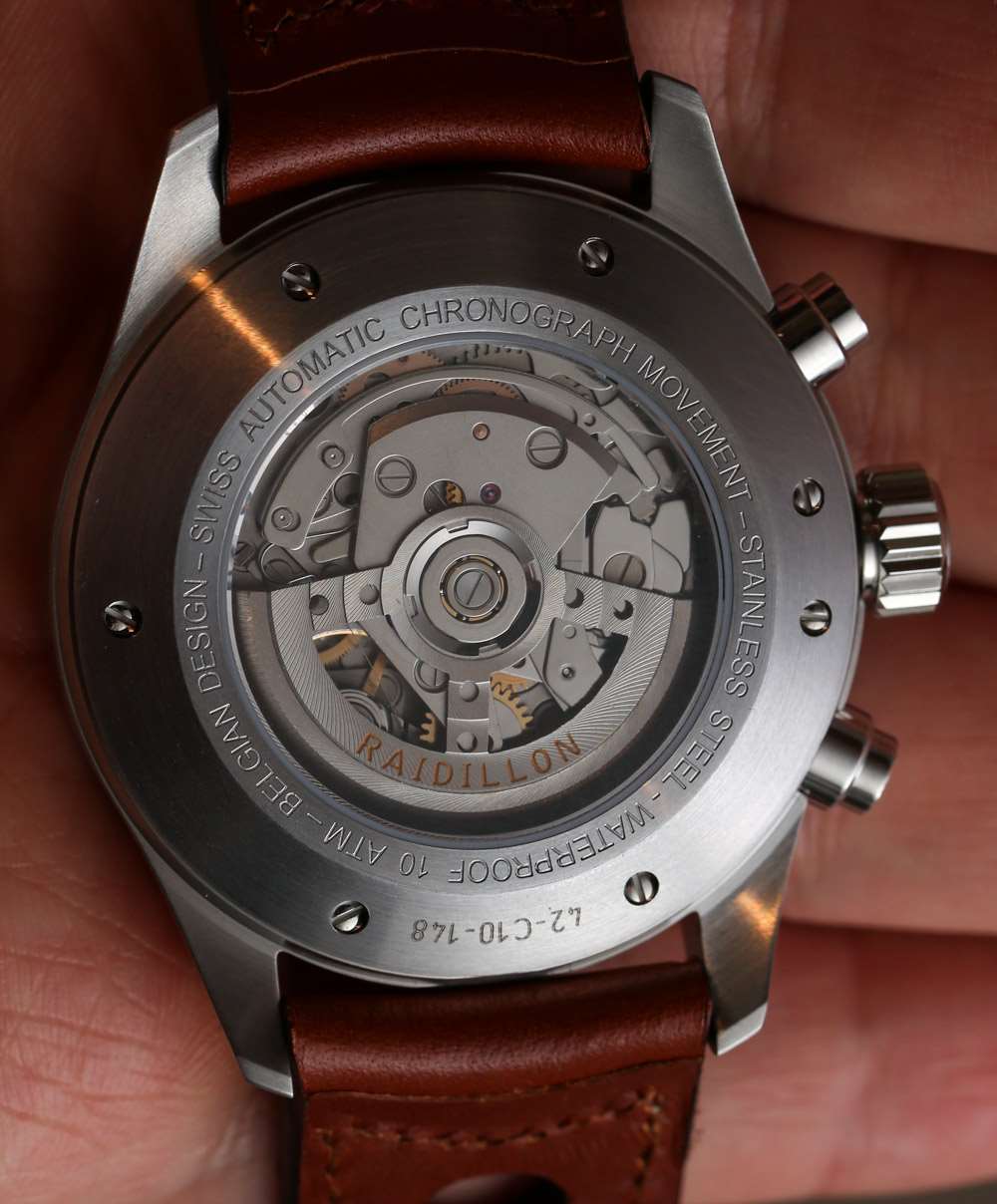 通過表殼后部,您可以通過藍(lán)寶石水晶顯示屏后蓋查看 7750 機(jī)芯,您會發(fā)現(xiàn)一個定制擺陀。我得到的明顯印象是,只要有錢和時間,Raidillon 就會越來越多地添加越來越多的定制部件。對于新品牌來說,這是一個非常普遍的問題——因?yàn)樾枰嗄甑耐顿Y和研究才能找到新的優(yōu)秀供應(yīng)商來生產(chǎn)更多獨(dú)特的東西,甚至開始在內(nèi)部生產(chǎn)東西。內(nèi)部制造的好處是設(shè)計靈活性和節(jié)省時間。完全依賴供應(yīng)商的小品牌在等待零件進(jìn)貨方面有很長的準(zhǔn)備時間,而且通常這些零件永遠(yuǎn)不會正確完成。知道這一點(diǎn)讓我想知道 Raidillon 需要多久寄回表盤之類的東西,因?yàn)楣S這里或那里的顏色有點(diǎn)不對。