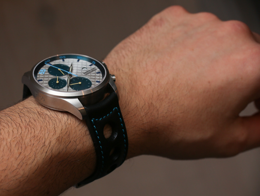 這兩款手表分別是帶有巴黎釘紋的奶油色表盤 Raidillon 計時碼表 42-C10-148 和黑色、藍(lán)色和銀色 Raidillon 計時碼表 42-C10-159。它們基本上都是同一只手表,但您可以體會到使用不同的表盤和表帶可以實(shí)現(xiàn)多么不同的外觀。Raidillon 還有其他型號以及三針機(jī)芯,但在我看來,該品牌現(xiàn)在的重點(diǎn)是他們可以用這些計時碼表做的有趣的事情。
