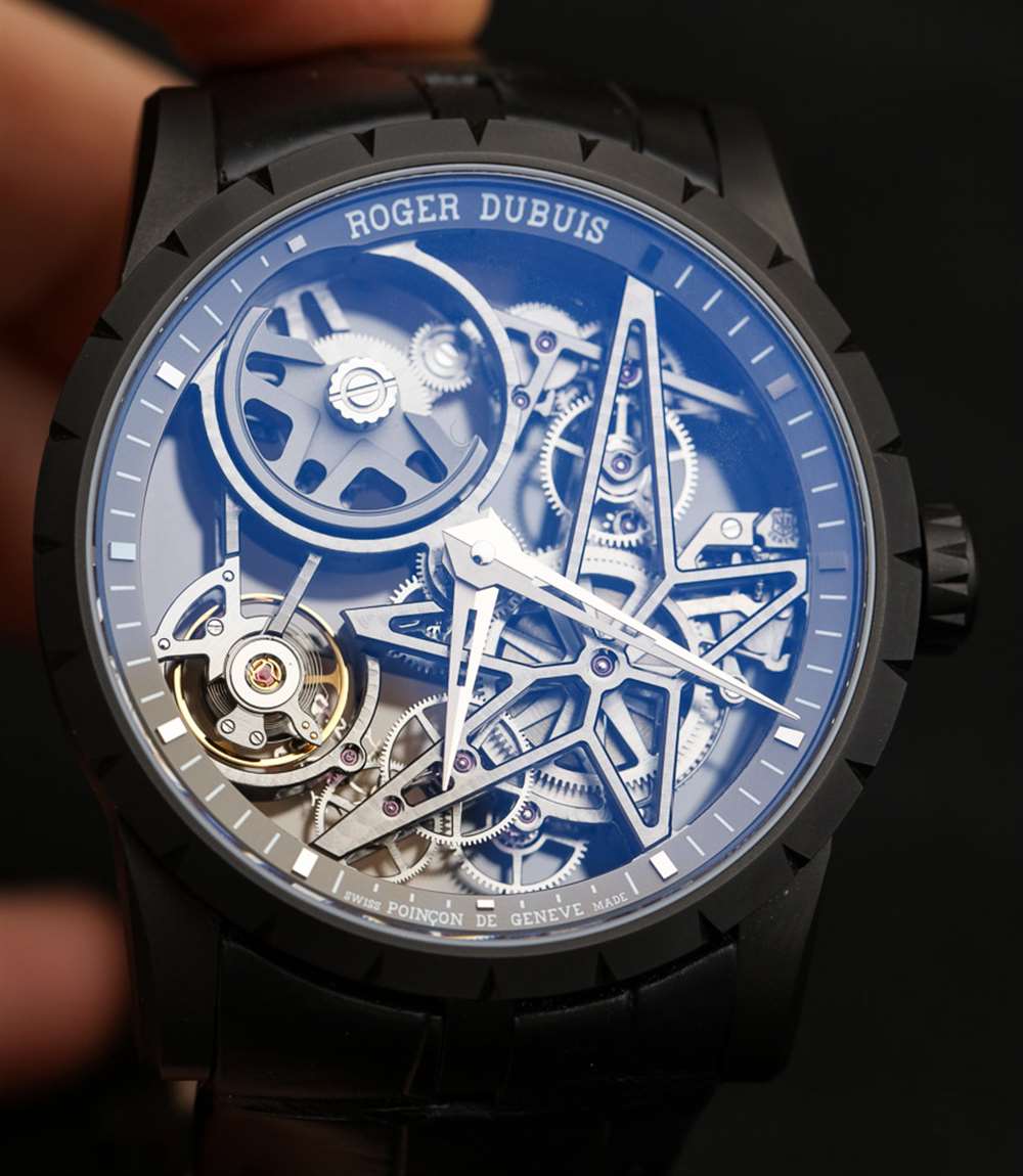 更寬的表耳和更薄的表圈讓這款手表感覺起來最大,而在手腕上它甚至薄到可以放在袖子里。對于這款表款,Roger Dubuis 為整個黑色 DLC 涂層鈦金屬表面選擇了完全啞光處理,而“光澤”則體現(xiàn)在機芯本身上。最后是表殼,防水深度達 30 米,并配有專有的表帶連接系統(tǒng),用于制作精良的錐形黑色鱷魚皮表帶。表帶連接到匹配的黑色 DLC 涂層鈦折疊展開器。最后我要說的是,表殼和表帶一起構(gòu)成了一款非常輕便的時計,其缺少質(zhì)量有助于佩戴舒適。