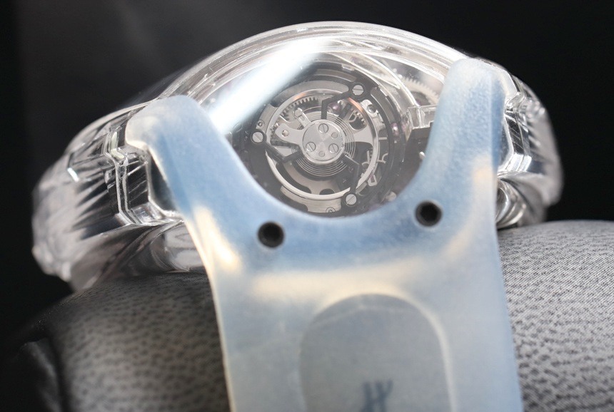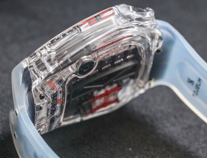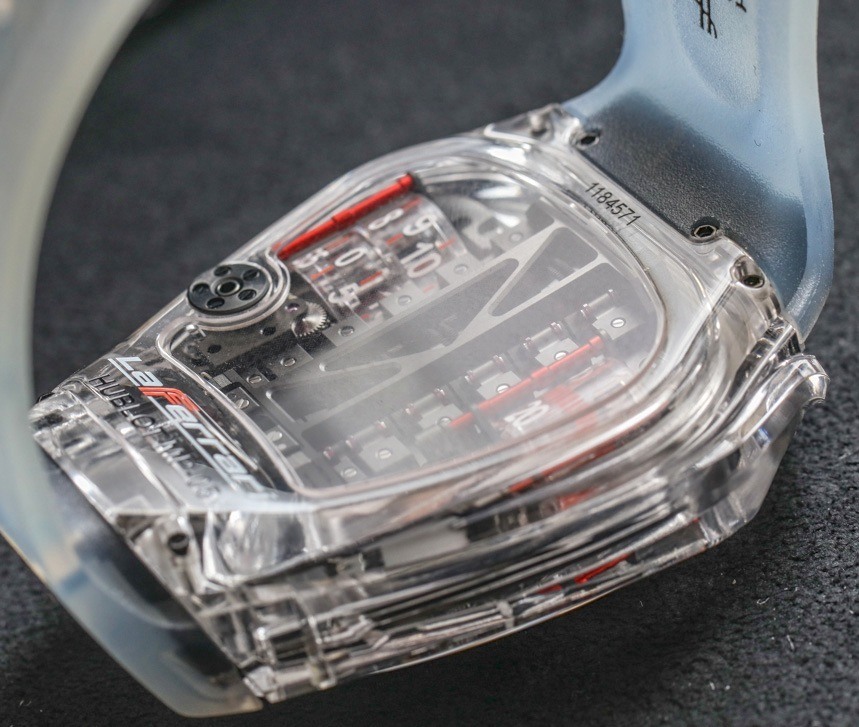 手表制造商對藍寶石水晶手表所做的最奇怪的事情之一就是將“透明”主題帶入表帶。對于這個型號,Hublot 擁有我認為是幾乎透明的“磨砂”硅膠表帶和鈦扣。這很有趣,但我有一種感覺,這款手表的主人會想要將表帶換成更時尚的東西,因為藍寶石水晶表殼的透明主題本身就足夠了,而無需延伸到表帶。毫無疑問,Hublot 已經想到了這一點,而 Hublot MP-05 LaFerrari Sapphire 可能至少配備了另一種表帶選項。