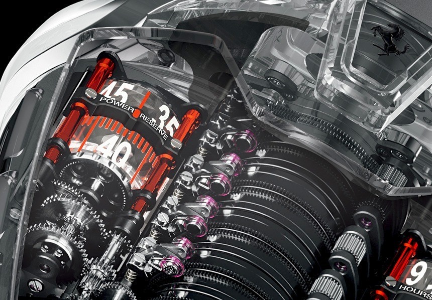 機芯酷炫得令人窒息,在藍寶石水晶表殼內,它比以往任何時候都更加醒目。該機芯由 637 個零件和 108 顆寶石制成,以 3 赫茲(21,600 次/小時)的頻率運行,并以秒指示時間,此外它還擁有旋轉鼓上的動力儲存指示器。不,Hublot MP-05 LaFerrari 手表從來都不是理想的易讀性,但它完成了工作。更重要的是,整個表殼看起來就像一個法拉利發動機艙,里面的機械機芯當然代表著發動機。廣告留言廣告信息結束