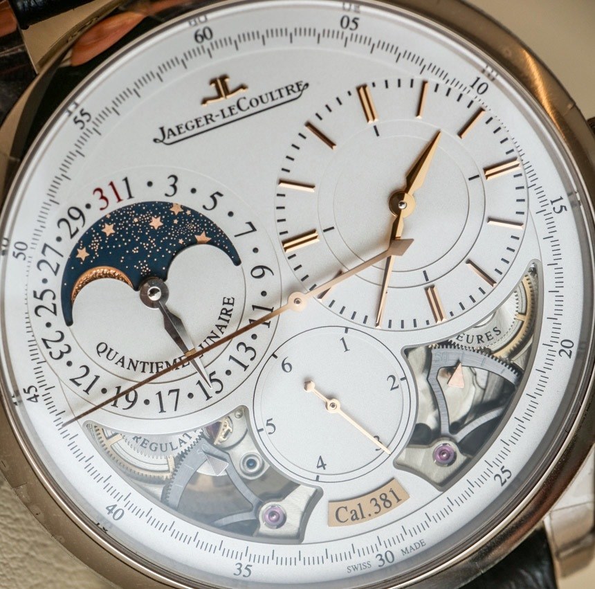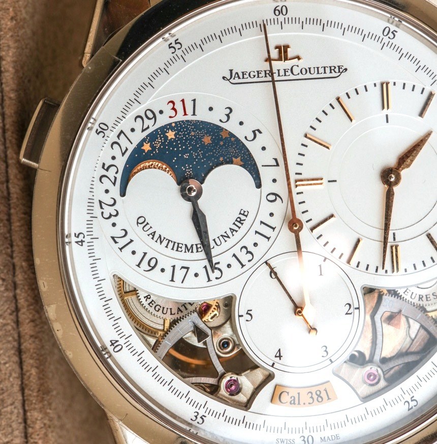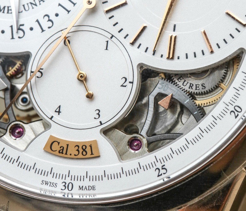 Duomètre Quantième Lunaire 內部裝有 Jaeger-LeCoultre 自制的 381 型手動上鏈機芯,該機芯主要由 374 個零件以德國銀制成。它以 3 赫茲(21,600 次/小時)的頻率運行,并具有 50 小時的動力儲存。您可以在表盤底部的切口部分看到動力儲存指示器,并查看機芯。381 型機芯的一個關鍵元素是 foudroyante 復雜功能,它在 6 點鐘位置有一個“飛行”1/6 秒針。主表盤用于顯示秒針,而右側的副表盤則用于指示小時和分鐘。