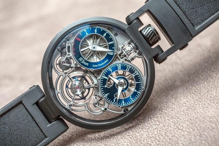 Bovet Pininfarina OttantaSei 10-Day Tourbillon 手表也很輕——尤其是兩個(gè)鈦金屬版本。我必須承認(rèn),考慮到 12 點(diǎn)鐘位置的“蝴蝶結(jié)式”表冠位置,它佩戴起來(lái)非常時(shí)尚,但并不不舒服。Bovet 聲稱(chēng)即使是黃金表殼也僅重 51.66 克(不含表帶)。整個(gè)設(shè)計(jì)的重點(diǎn)是讓 Bovet Pininfarina OttantaSei 10 天陀飛輪看起來(lái)輕盈……輕盈。
