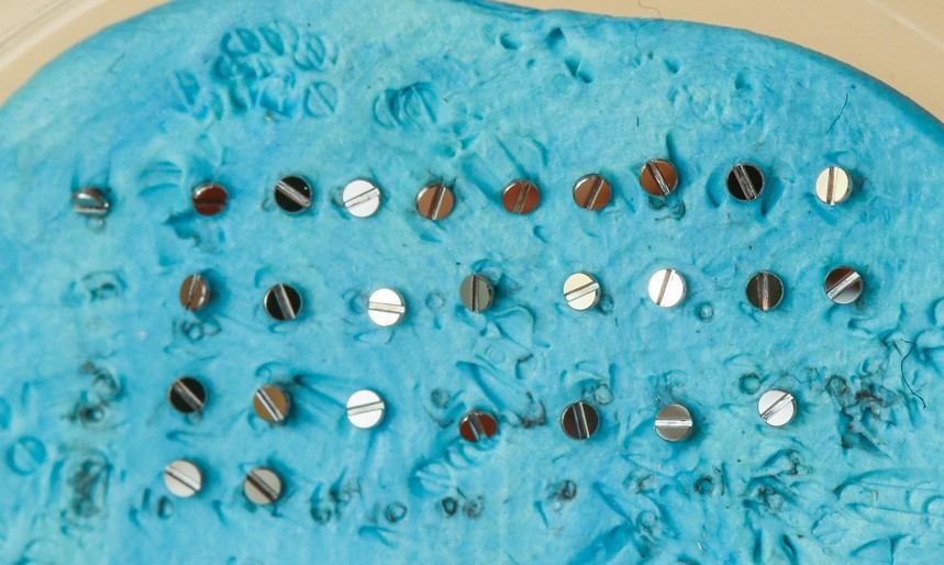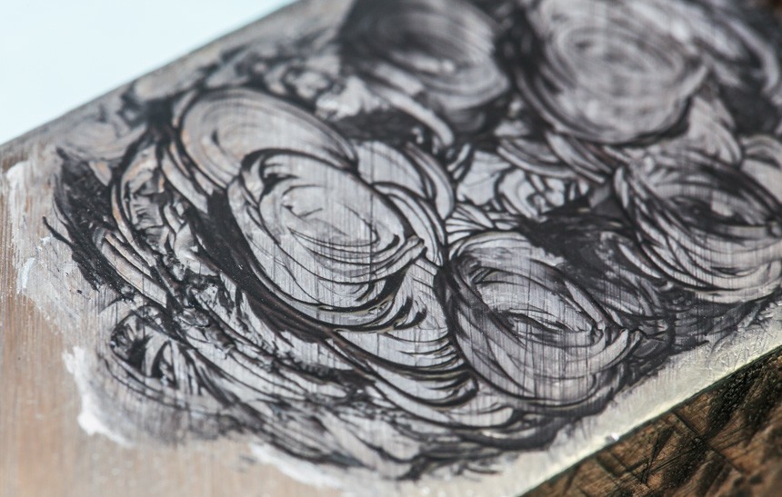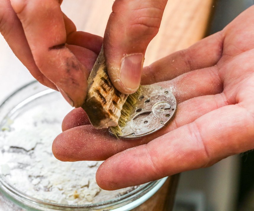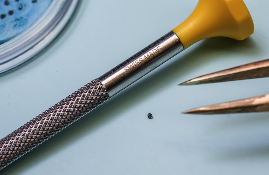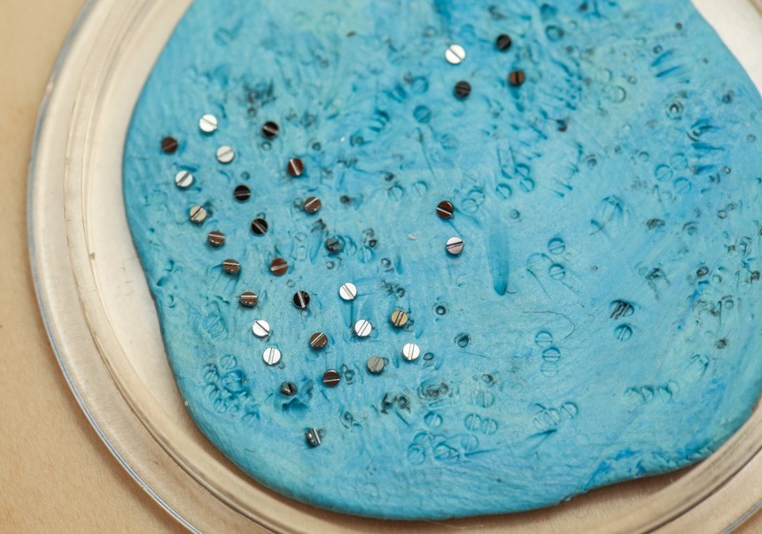 我正在看著一位年輕的制表師在一塊錫板上拉東西。是的,舊的“罐頭金屬”顯然是理想的底座,上面涂上一層薄薄的金剛石膏以“黑色拋光”螺絲的尖端。當我盯著一個小盤子時,一顆螺絲被小心翼翼地滑過錫棒的表面并拉動,藍色的粘性材料上鑲嵌著閃亮的金屬片,幾乎在任何制表師的辦公桌上都能找到這種材料。在膩子的藍色“無劃痕區”中,是一系列經過精心加工的成品螺絲。