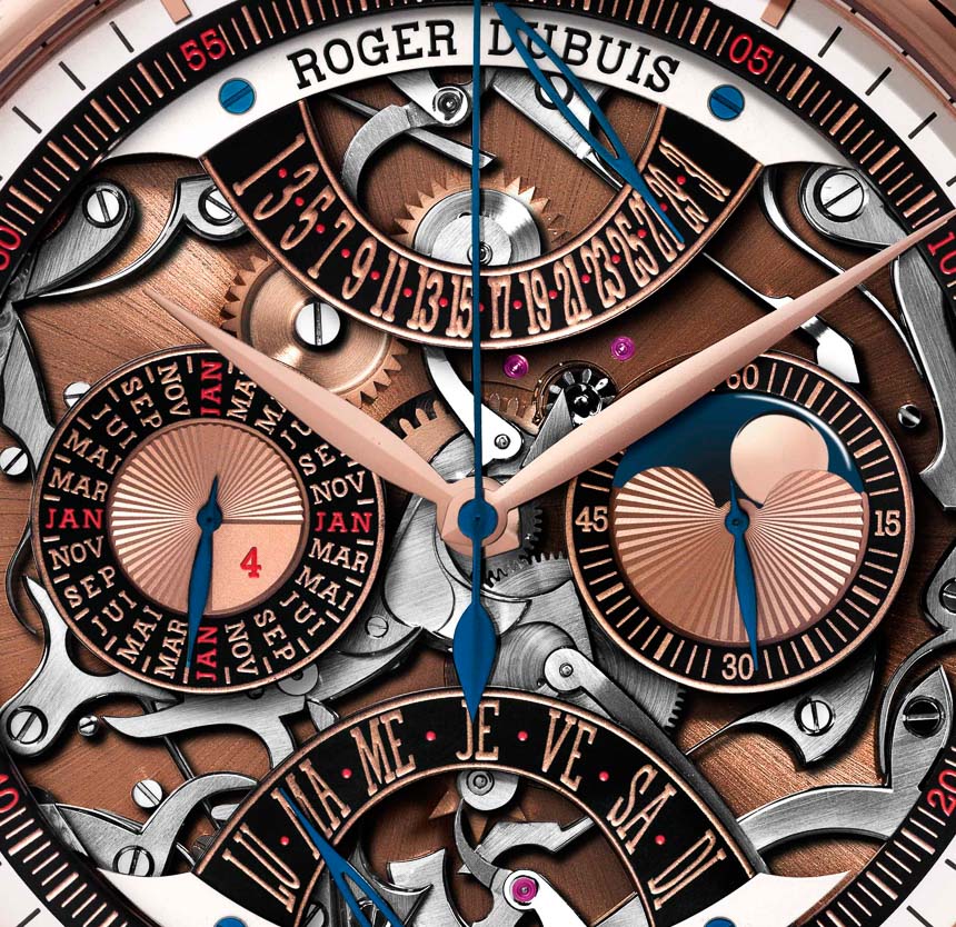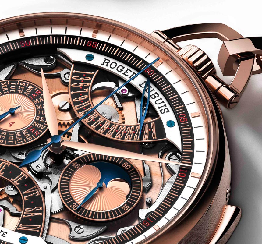 Roger Dubuis 進一步聲稱,大約 1,950 小時的人工時間用于修復和重新設計以 18,000 bph 運行并由 558 個零件生產的機芯。該機芯具有時間、單按鈕計時碼表、帶逆跳指示器的萬年歷、月相指示器和三問報時功能。鑒于 Roger Dubuis 是日內瓦印記的全部,RD181 也帶有“Poin?on de Genève ”。印章的部分標準是隨著時間推移的準確性。話雖如此,看到 Roger Dubuis 聲稱以下內容很有趣(具有諷刺意味的是,它的手腕時間適用于懷表):