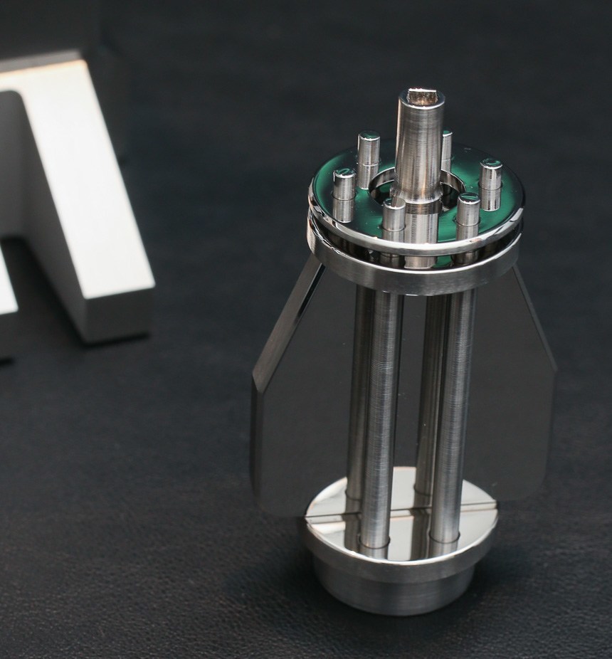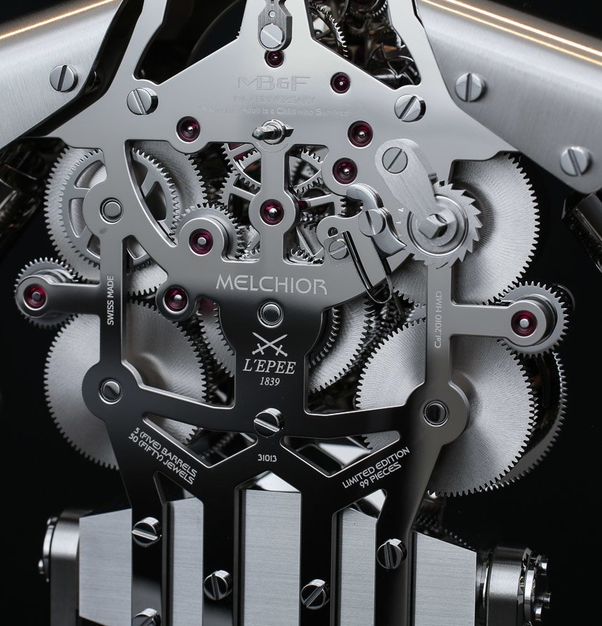 L’Epée 手動上鏈時鐘機芯由 334 個零件組成,運行頻率為 2.5Hz (18,000)。盡管它是一款本應靜止的時鐘機芯,但平衡輪系統具有 Incabloc 防震系統,因為 MB&F 假設人們會比大多數其他桌上或臺鐘更頻繁地全天候移動。長動力儲存儲存在五個主發條盒中。