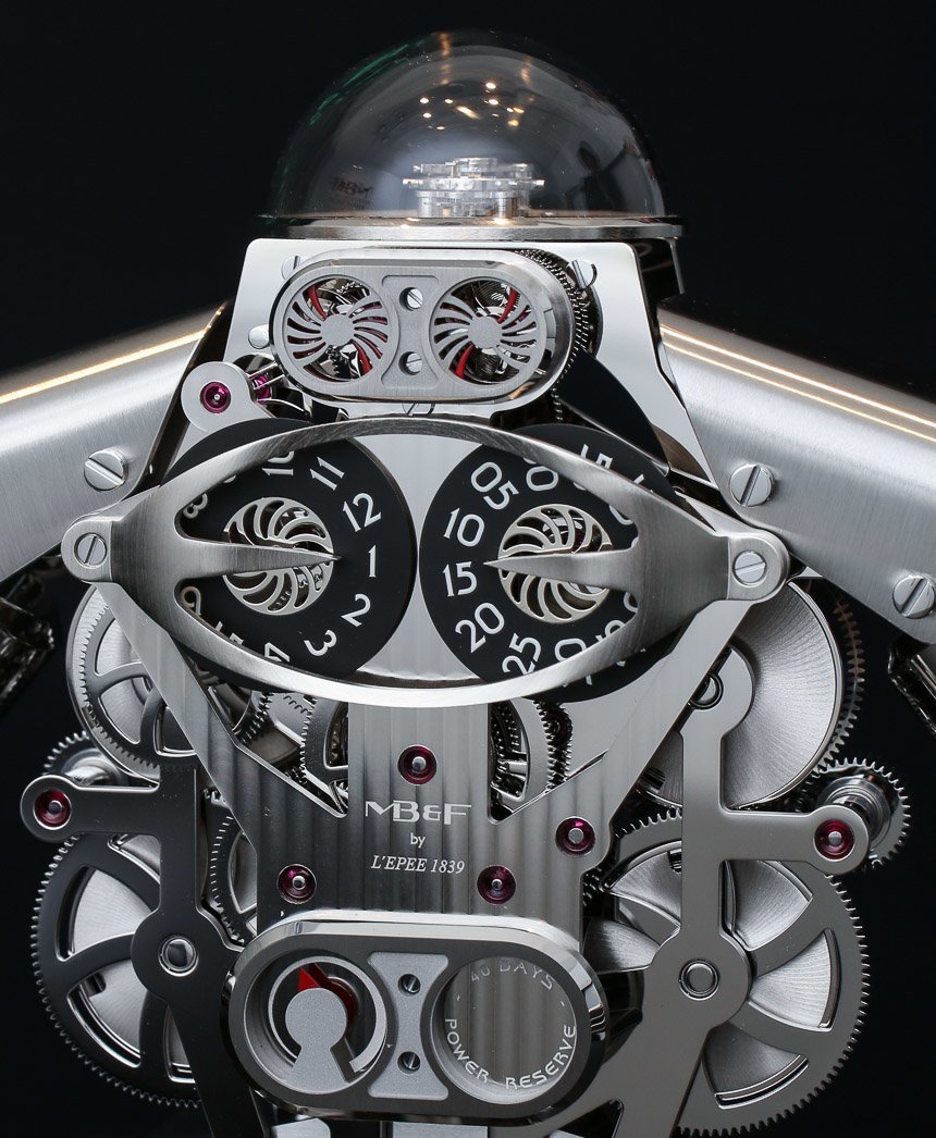 向下移動到 MB&F Melchior 的軀干,您會看到用于指示分鐘和小時的圓盤。如果您有興趣使用 MB&F Melchior 看時間,這就是您主要關注的地方。再往下看機器人的骨盆區域,您會看到一個動力儲備指示器。L’Epée 生產的機械機芯具有 40 天的總動力儲存——這是一個很好的時間,所以時鐘附帶一個附加的發條鑰匙是很好的。