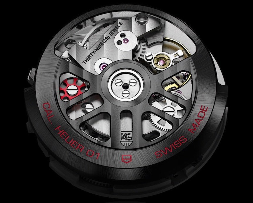 讓我們討論一下 TAG Heuer Calibre Heuer 01 機(jī)芯。你需要知道的是,從結(jié)構(gòu)上看,它或多或少是一枚現(xiàn)有的豪雅自制calibre 1887自動(dòng)計(jì)時(shí)機(jī)芯。然而,它被稍微鏤空并賦予了一些新的顏色(比如醒目的紅色導(dǎo)柱輪),變成了 Heuer 01。它不會(huì)取代 1887,只是在以2015 年泰格豪雅 Calibre Heuer 01 腕表。