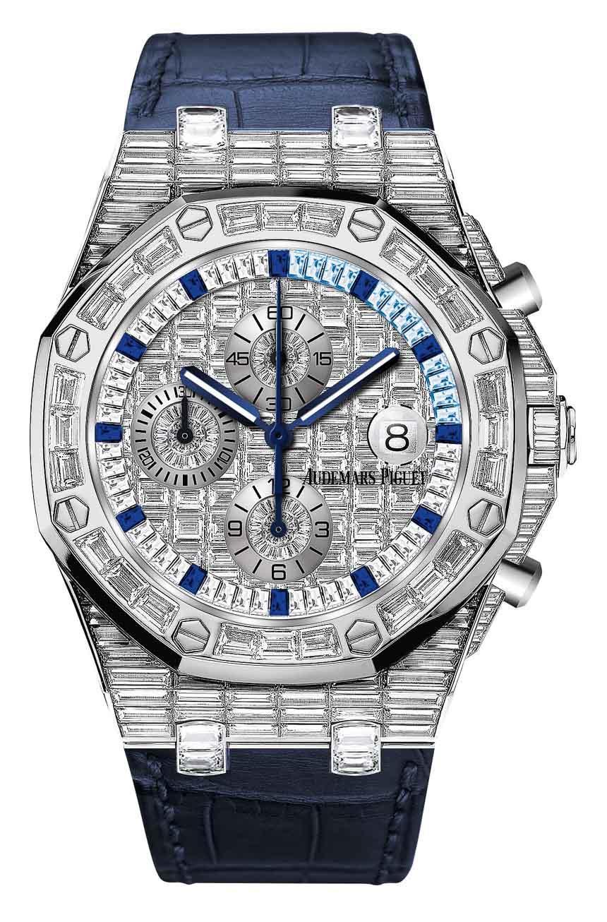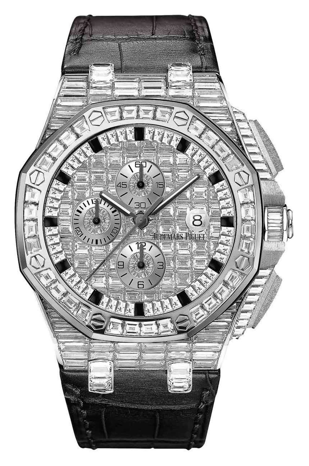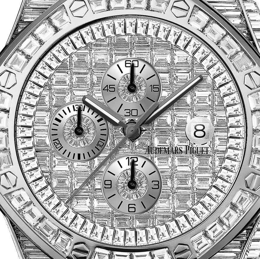 這些全密鑲手表均采用 18k 白金表殼,表殼上鑲嵌了多達幾十克拉的鉆石。Audemars Piguet Royal Oak Offshore Chronograph 44mm 表殼和表鏈上鑲嵌了 53 克拉的寶石,表盤上鑲嵌了 6.53 克拉的寶石。那是近 60 克拉的鉆石和數百顆長方形切割鉆石。不幸的是,這款和其他皇家橡樹離岸型手表的珠寶版本將表殼的防水性能更改為僅 20 米。在這種情況下,您可能想稱它為“Royal Oak Onshore”。