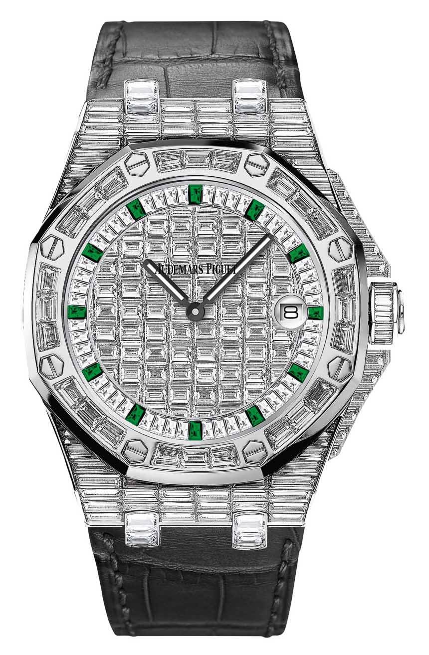 女士們可以獲得三個版本的鑲鉆“非凡”愛彼皇家橡樹離岸型手表。型號 67543BC.ZZ.D002CR.01 配有黑色鱷魚皮表帶,表盤上鑲嵌著綠色祖母綠,鑲嵌約 290 顆鉆石(16 克拉)和另外 12 顆長方形切割祖母綠。還有一款類似的女士皇家橡樹離岸型,配粉色鱷??魚皮表帶,表盤上搭配粉色藍寶石。