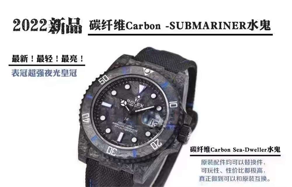 VS廠開款的DIW碳纖維水鬼,手表是碳纖維材料。碳釬焊材料是一種新的應用材料,顏色是永不過時的黑色,整體紋理非常優雅,紋理多變,就像“世界上沒有完全相同的葉子”由于切割方式不同,每一塊碳纖維腕表都會表現出不同的紋理,成為獨一無二的存在。