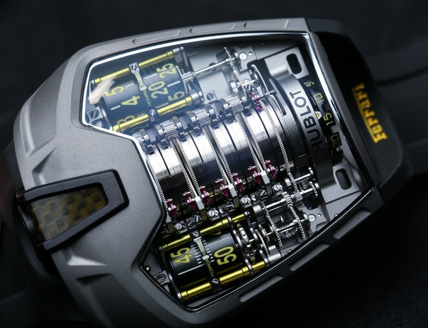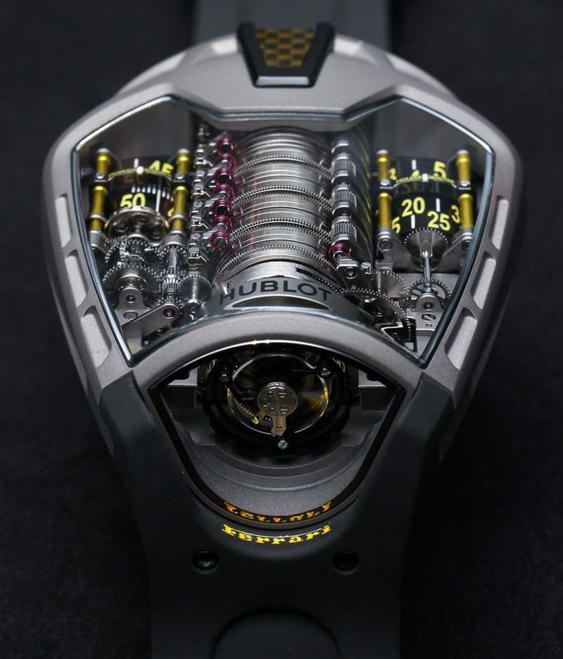 現在,如果你是一個鐘表愛好者,并且 Hublot MP-05 LaFerrari 手表的機械和設計比 Hublot 與法拉利的業務關系更有趣,那么你會想知道的是 Hublot MP-05 LaFerrari 手表擁有地球上所有機械表中最長的動力儲存。看到機芯中央的那一堆桶了嗎?在 11 個主發條盒之間,內部制造和設計的 Hublot 口徑 HUB9005.H1.6 機芯具有 50 天的動力儲存。那是大約 1,200 小時。僅作比較,標準機械機芯的動力儲存約為 42 小時。